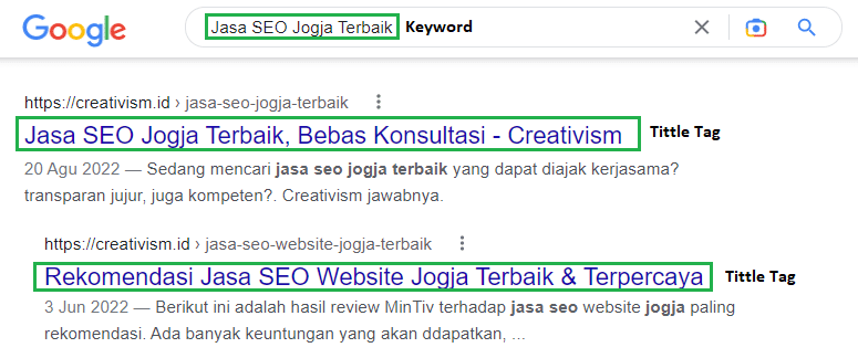 Yang pertama adalah title tag. Bagian ini menjelaskan tentang konten website Anda. Akan muncul pada halaman pencarian Google di bawah url. Title tag adalah bagian penting dari konten website yang bisa menarik perhatian audiens. Semakin menarik title tag yang Anda kreasikan, maka semakin tinggi keinginan audiens untuk melakukan klik.